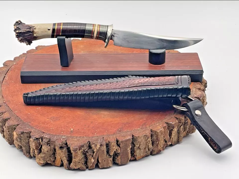 Custom Scagel Knife 6 Inch Steel Blade with Crown Stag Pommel and Leather Sheath